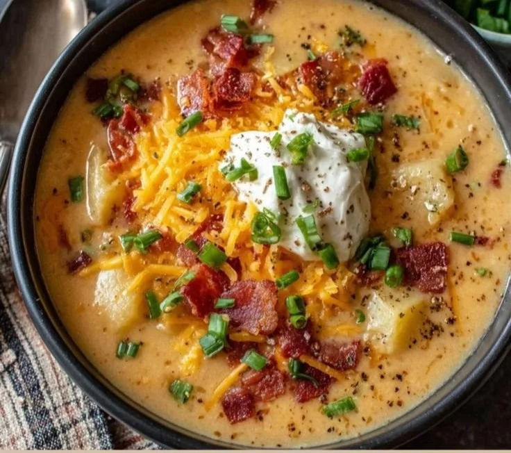 - Ladle soup into serving bowls. Top each portion with crumbled bacon, additional shredded cheese, and chopped green onions before serving.