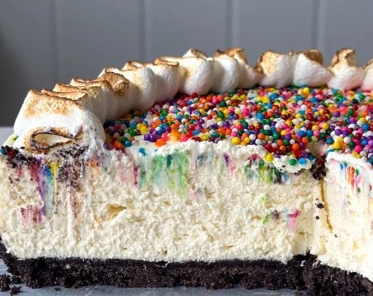 - Whip the mixture until it forms stiff peaks and spread it over the top of the cheesecake.