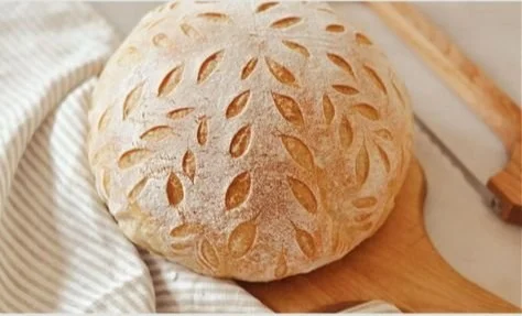 Once the oven is ready, gently turn the dough out onto the parchment paper. Score the top of the dough with a knife or razor blade to make your desired design.