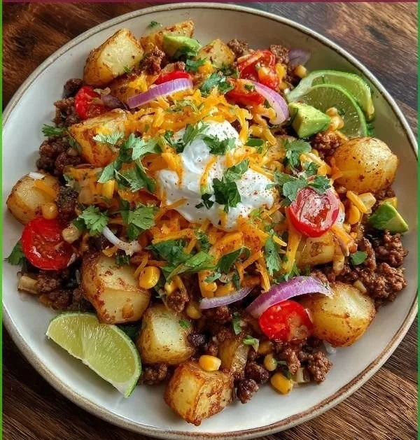 Loaded Potato Taco Bowl is a fun and delicious meal that combines two favorite dishes: baked potatoes and tacos. It’s perfect for busy weeknights or casual gatherings with friends. This recipe is easy to make and allows you to personalize it with your favorite toppings. You get the creaminess of sour cream, the crunch of fresh veggies, and flavorful beef all in one bowl!