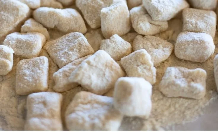 - Roll the dough out into a square so it’s about 1/4” thick. Use a pizza cutter or bench scraper to cut the dumplings to be 1/2” x 1/2”.